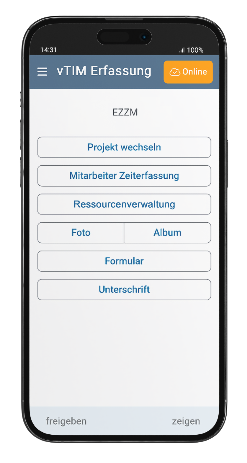 Erfassung von Mitarbeitern, Projekten & Tätigkeiten Erfassung von Artikeln, Material und Maschinen Erfassung von Texten & Fotos mit Zuordnung zu Projekten Erfassung von Unterschriften mit Zuordnung zu Projekten Barcode- & QR-Code Scanner Live- oder Nacherfassung Komfortable Filterfunktion auch bei umfangreichen Stammdaten (z. B. Artikellisten) Umfassende Berichtsmöglichkeiten (z. B. Bautagebuch) App für iOS- & AndroidSmartphones oder -Tablets, Windows-Tablets.